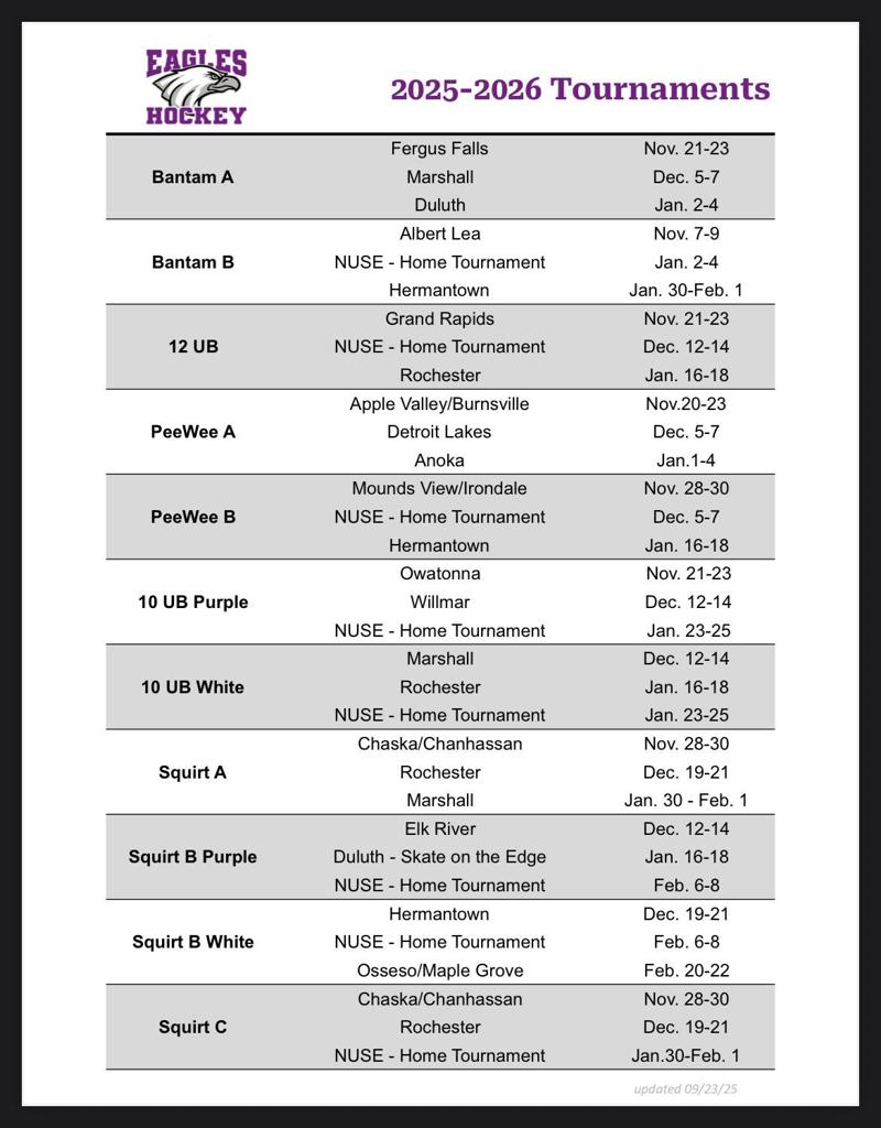 10U/Squirt and up Tournament Schedule